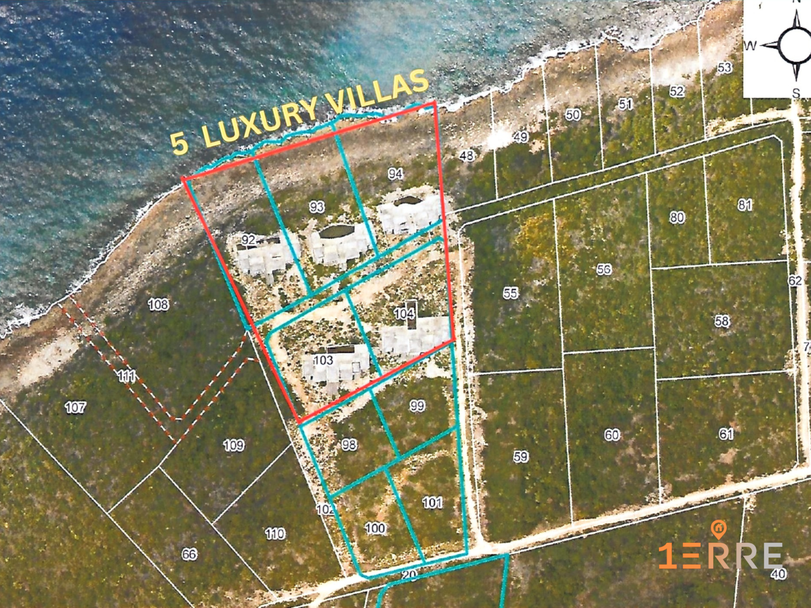 Le domaine totalise neuf parcelles. Trois parcelles d’environ 3 000 m² chacune (≈ 0,75 acre) sont en front de mer ; deux autres, de superficie équivalente, sont en seconde ligne avec vue mer ; ces cinq parcelles accueillent les cinq maisons principales. Quatre parcelles supplémentaires d’environ 2 000 m² chacune (≈ 0,50 acre) sont situées à l’entrée ; l’une d’elles abrite un puits d’eau douce non potable, utile aux opérations. L’ensemble peut être clos de murs et est conçu pour être desservi par une voirie intérieure menant à chaque villa.