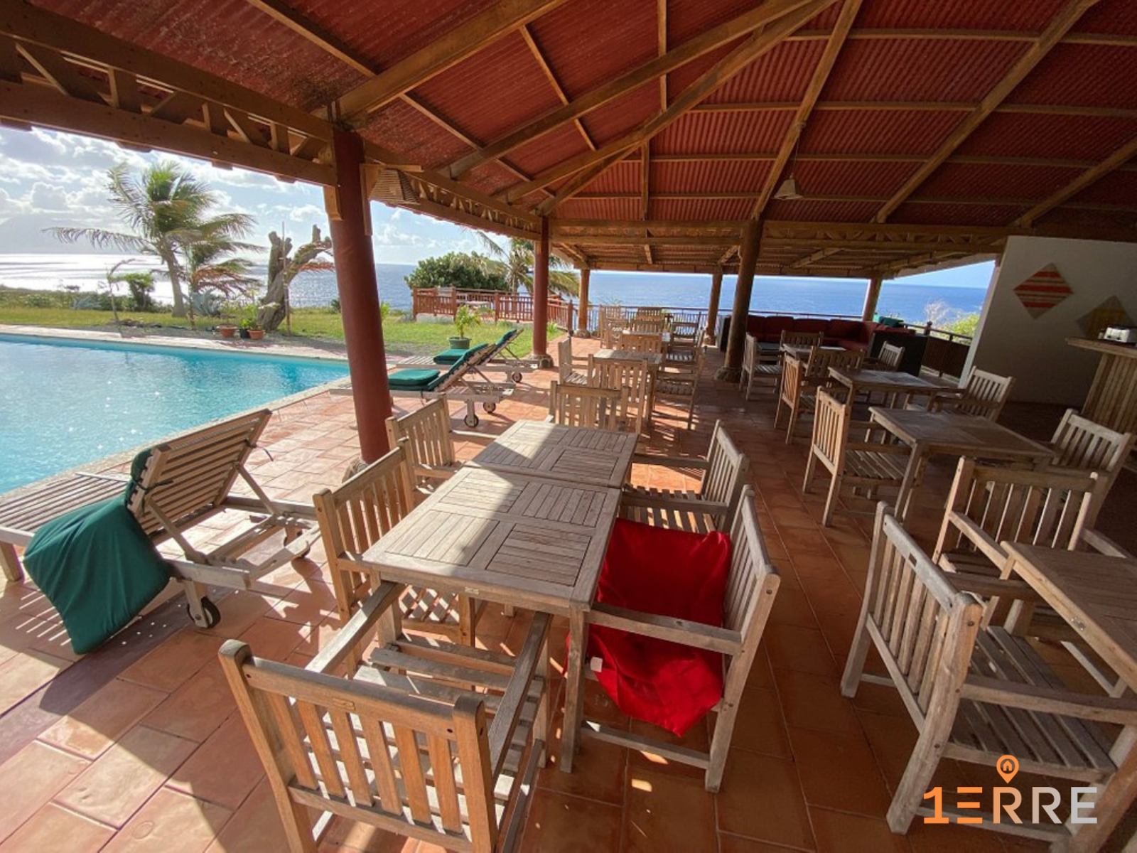 Le pool house est construit sur une structure en béton avec charpente en bois et toiture métallique. Les sols sont carrelés.