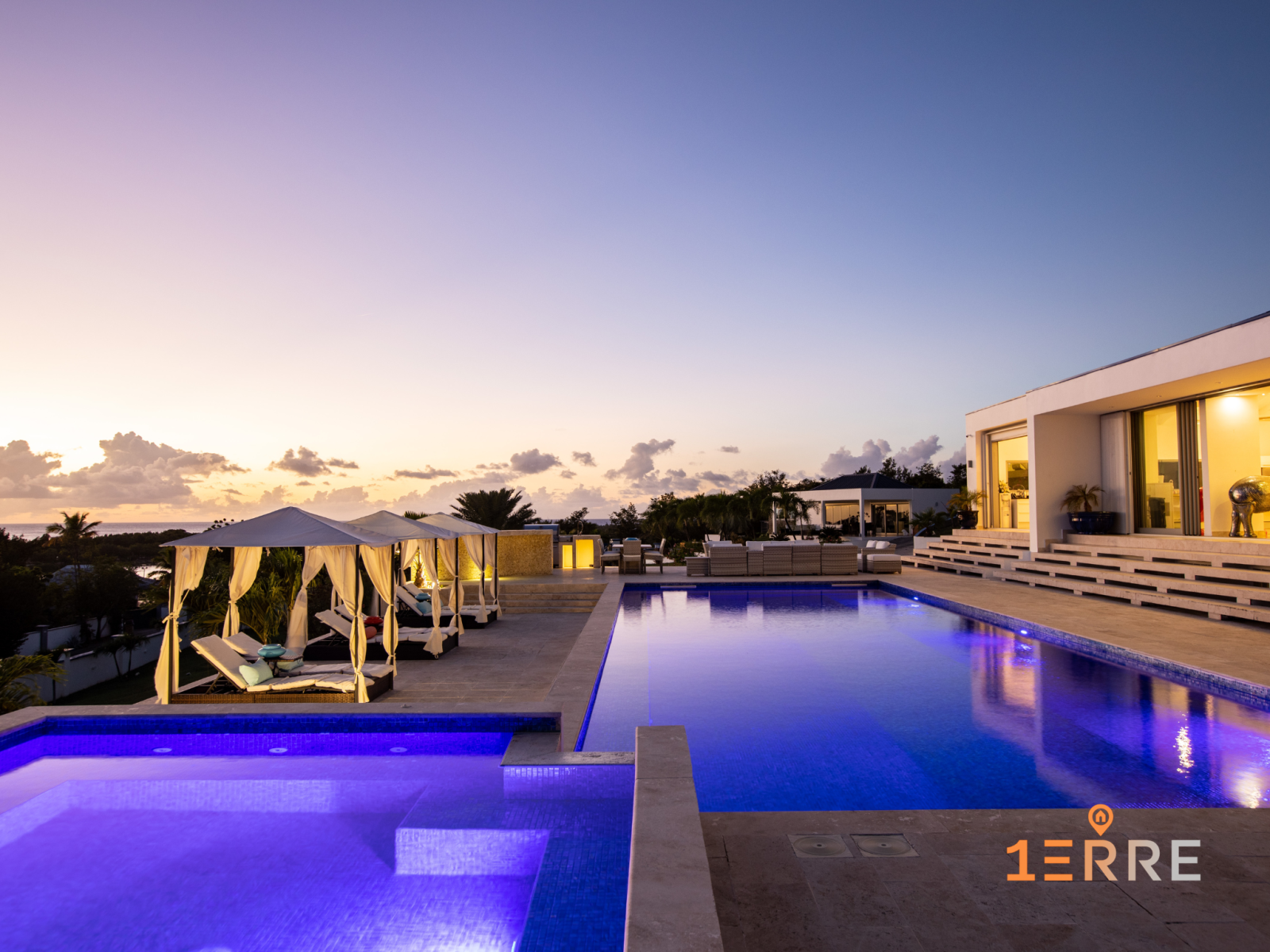 La propriété se compose d’une maison principale avec de vastes espaces de vie ouverts sur une grande terrasse, une piscine à débordement et un jacuzzi face à l’océan. La cuisine haut de gamme, parfaitement équipée, est idéale pour recevoir.